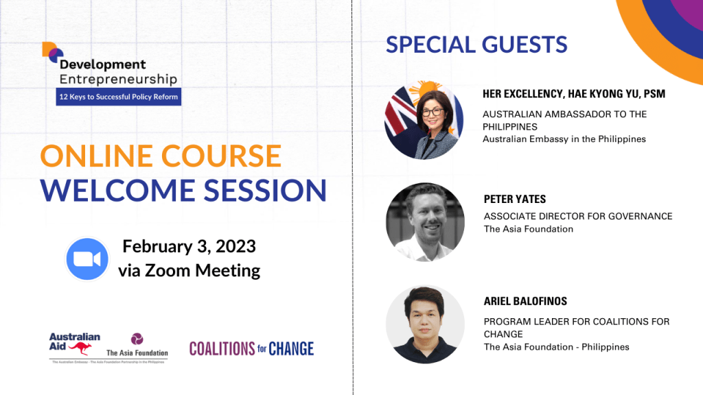 The Asia Foundation, with the support of the Australian Embassy in the Philippines, is holding the 4th Development Entrepreneurship (DE) Online Course and Welcome Session on February 3, 2023 via Zoom to support a community of reform leaders in using the DE approach to policy reform.